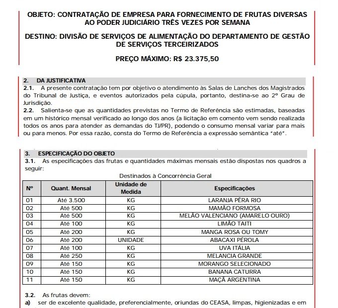 Pelo edital constam 3,5 mil quilos de laranja na especificação do objeto do pregão. Também 500 quilos de mamão formosa, 500 kg de melão ouro, 250 kg de melancia, 200 kg de manga, 200 abacaxis pérola, 150 kg de morango, 150 kg de banana caturra, 150 kg de maçã argentina, 100 kg de uva Itália e 100 kg de limão taiti.