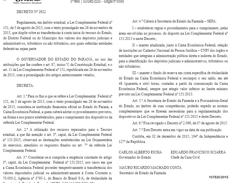 É o decreto estadual 2.922/2015, disponível na edição 9.589 do Diário Oficial do Estado (DOE). O papel confirma a adesão do Paraná à lei complementar federal 151/2015, promulgada na semana passada, dia 25 de novembro, pelo Congresso Nacional. Ela garante a todos Estados e prefeituras brasileiras o acesso a até 70% dos depósitos judiciais relacionados a ações em que o ente público é parte. A medida é uma tentativa da União para “combater” a crise que ameaça as finanças públicas do país.