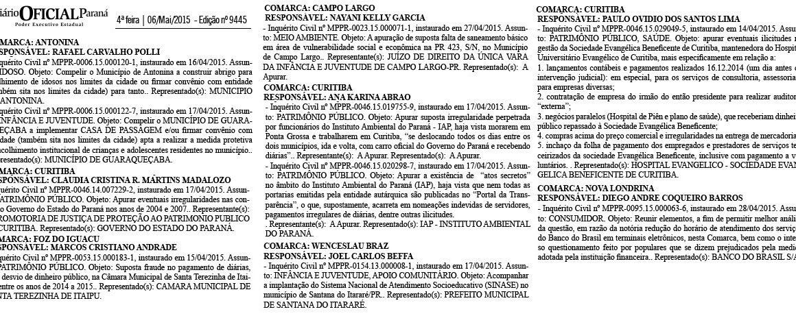 Na edição 9.445 do Diário Oficial do Estado (DOE), de quarta-feira passada (6), foi publicada uma relação com mais de 700 investigações abertas recentemente pelo Ministério Público do Paraná (MP-PR). São mais de 330 inquéritos civis (“indícios fortes”) e 390 procedimentos preparatórios (“suspeitas leves”), entre as páginas 190 e 242.