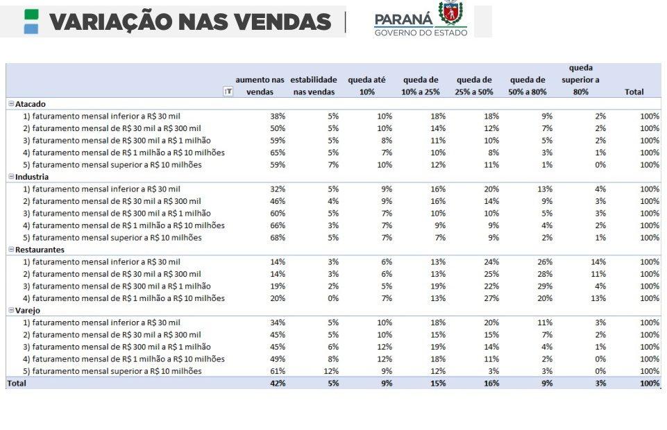 De abril a dezembro de 2020, 60% ou mais dos pequenos negócios estabelecidos no Paraná perderam vendas em comparação com o mesmo período do ano anterior. A análise é da Secretaria de Estado da Fazenda (Sefa), em relatório divulgado no início deste ano pelo Governo do Paraná e vale para varejo, atacado, restaurantes e indústria com faturamento mensal abaixo dos R$ 30 mil. Em notícia anterior sobre o mesmo documento, Livre.jor mostrou a queda de 3,4% na arrecadação de ICMS no estado.
