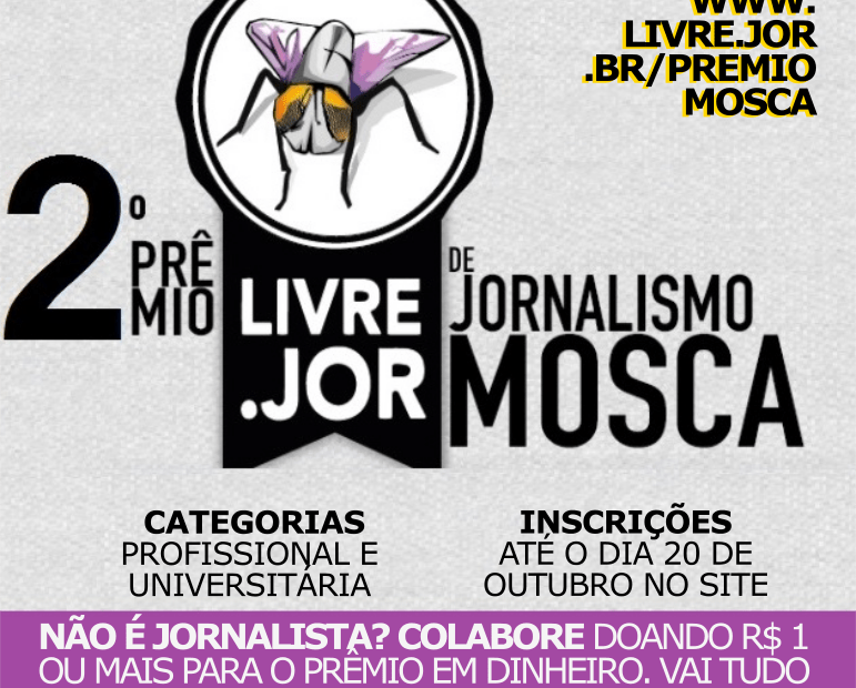 Jornalistas e estudantes têm até 20 de outubro para inscrever suas reportagens no 2º Prêmio Livre.jor de Jornalismo-Mosca. Podem concorrer notícias alicerçadas no uso de dados públicos, de documentos oficiais e da Lei de Acesso à Informação, conforme estipula o regulamento da competição. “O objetivo é propagar a cultura da transparência pública, emparedando as autoridades, que é o espírito da agência Livre.jor de jornalismo”, explica José Lázaro Jr., um dos organizadores, ao lado de Alexsandro Ribeiro, João Frey e Rafael Moro Martins.
