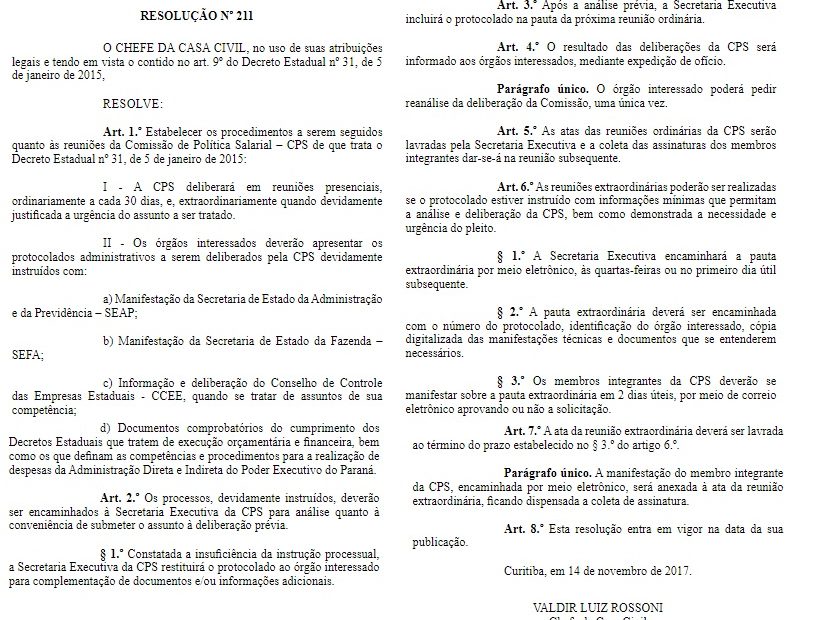 Quase três anos depois de condicionar qualquer aumento aos servidores da administração direta e indireta à aprovação da Comissão de Política Salarial (CPS), o Governo do Paraná regulamentou as reuniões desse grupo, que tem a palavra final sobre o assunto. A resolução 211/2017 foi publicada nesta quinta (16), na edição 10.068 do Diário Oficial do Estado, e fixa deliberações a cada 30 dias.