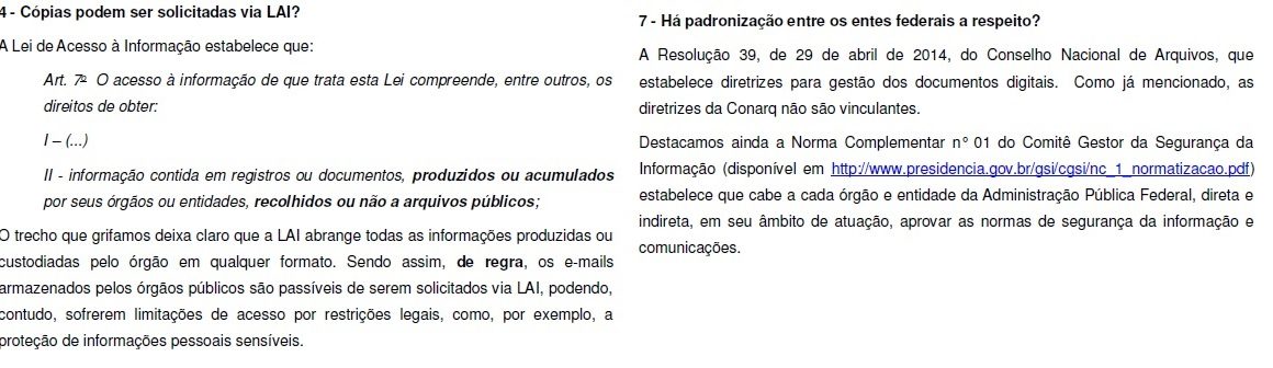 A Diretoria de Transparência e Controle Social da CGU disse que a requisição do teor dos emails oficiais está amparada pelo artigo 7º da Lei de Acesso à Informação, onde ficou estabelecido que “o acesso à informação trata, dentre outros, do direito de obter informação contida em registros ou documentos, produzidos ou acumulados por seus órgãos ou entidades, recolhidos ou não a arquivos públicos”.